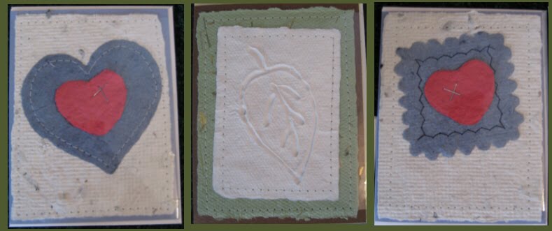 These feature handmade paper shapes which are sewn to handmade paper sheets sewn to the cardstock fronts!! The hearts have been stapled to the shape before sewing. The middle one features a leaf paper cast done in white handmade paper! I love sewing handmade paper and am planning to do more of it!! I brought a selection of cards which featured handmade paper which you have seen previously on my blog.