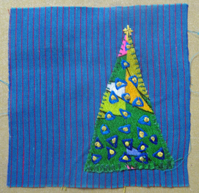 I have one more finished!!! I did have a bit of free time a couple of days ago and worked on it several times over the course of one day a few minutes at a time. This is another tree comprised of two fused halves which I am liking a lot better. I did a row of verticals and three rows of horizontal running stitches in green at the bottom and decided to repeat the pattern adding one more row of running stitch with each different colour. I managed to add dark pink, purple, green and orange which brought me to the top. My yellow star is looking a little mangled. I made it the same as the others but somehow that is how it worked out. To finish it off I added white french knots over the whole of it. I am liking coming up with different patterns and thought up a few more overnight to use on my next trees. I am enjoying the stitching. They don't take quite as long as the larger squares but are a little less creative in that they are all trees in the same colour scheme. Will change that up next time around. Therese